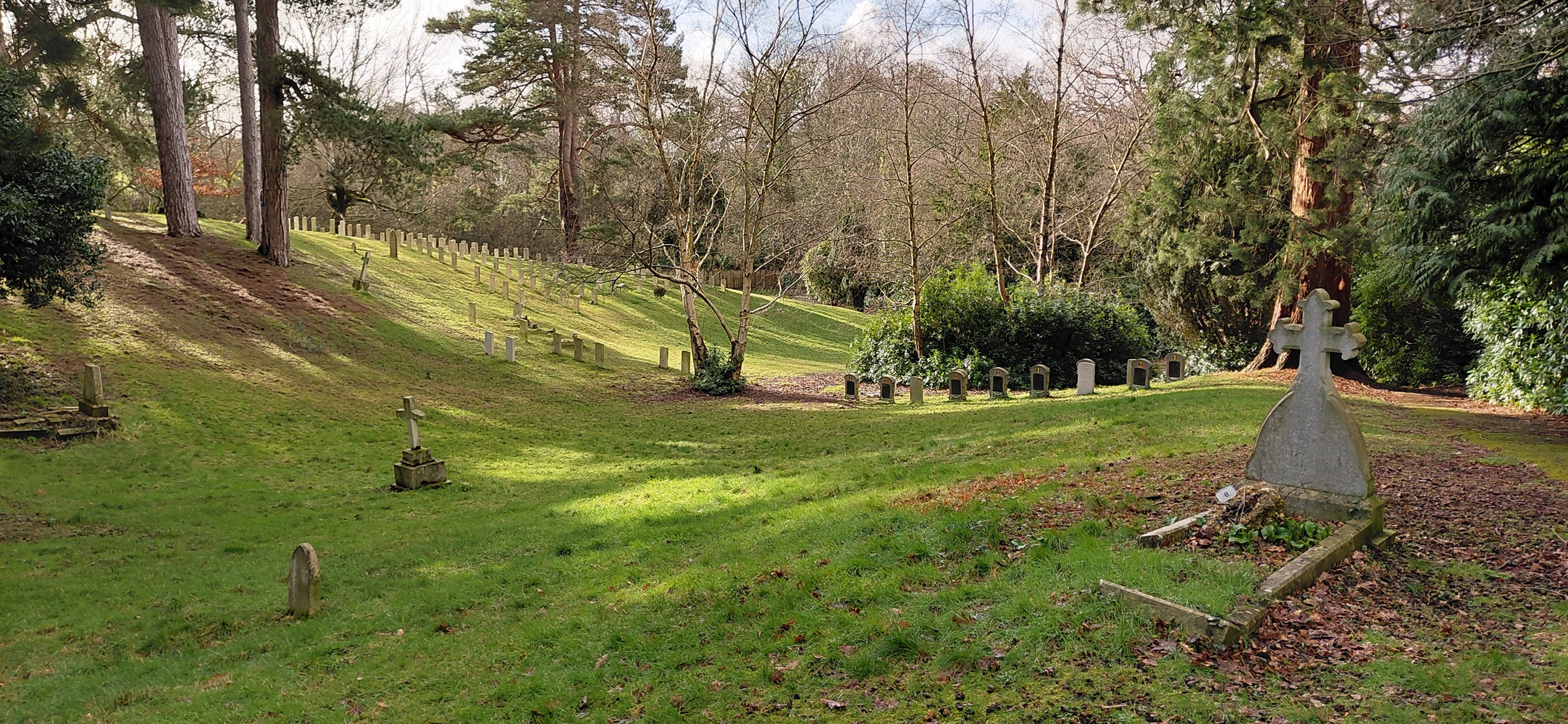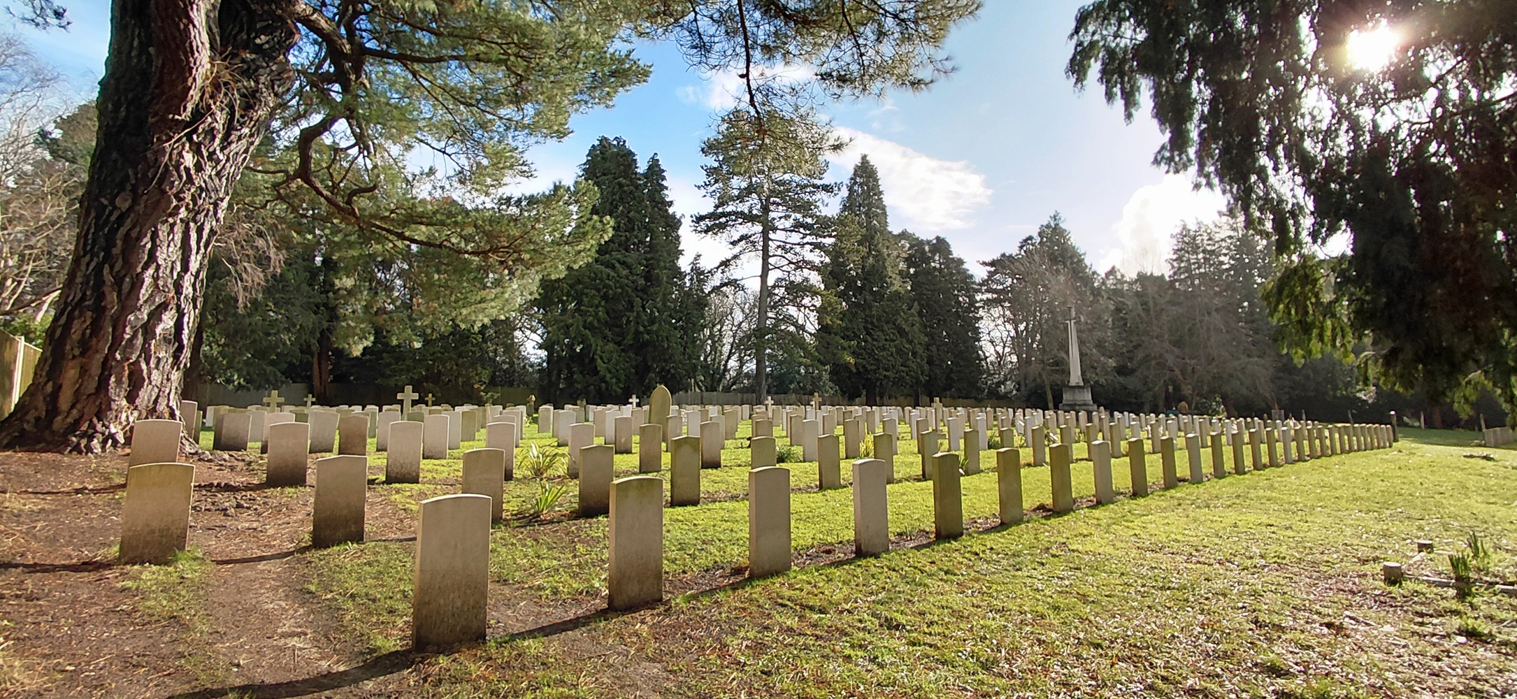 Nous passons ainsi à travers un verger, longeons la voie de chemin de fer pour finalement arriver au cimetière militaire de Netley, propriété du ministère de la Défense et lieu de sépultures de soldats britanniques, du Commonwealth et allemands datant de la Première et de la Seconde Guerre mondiale.