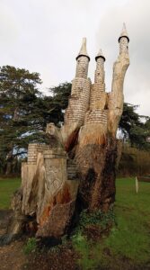 Une fois la voiture garée, nous avons déambulé dans le jardin et admiré une sculpture sur bois représentant l’univers féérique.
